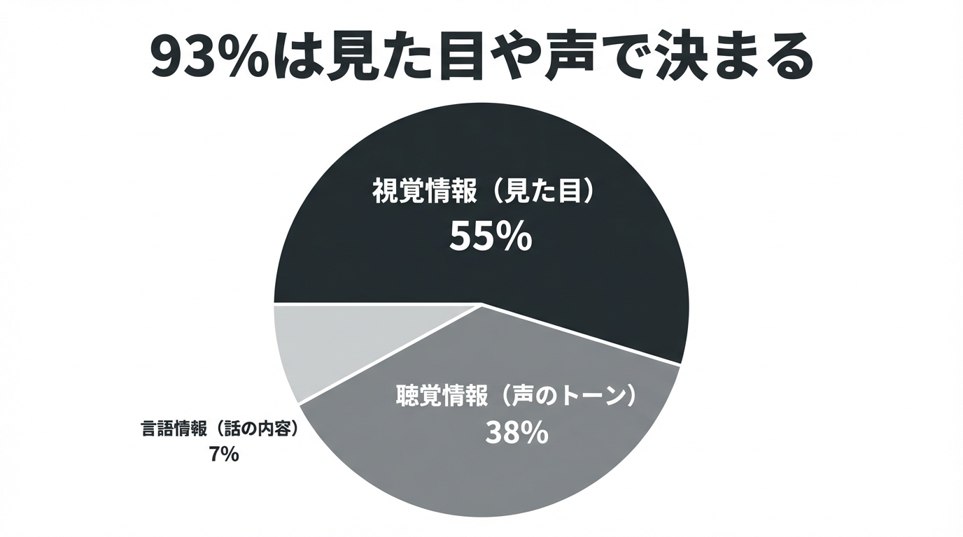 実は、人が相手を判断する時、話している内容の影響力はわずか7%。残りの93%は、見た目や声のトーンなどで決まってしまうんです。
